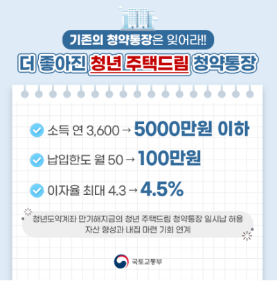 ㅇ 기존의 청년 우대형 주택청약 종합저축을 확대 개편한 것으로, 가입 요건과 이자율, 납입한도 등이 크게 개선되었습니다.