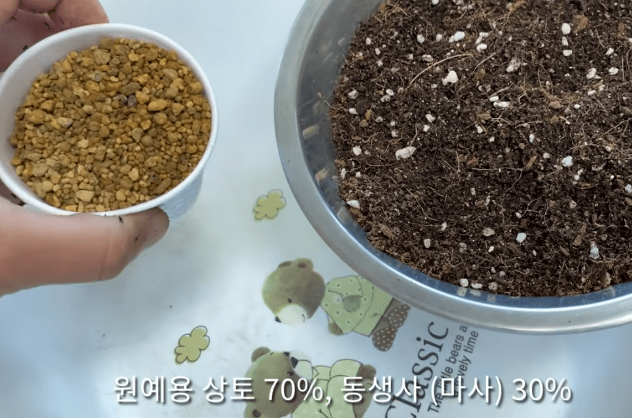 - 흙 준비 : 배수성이 좋은 흙을 사용합니다. 일반적인 화분용 흙에 펄라이트나 마사토를 섞어 사용하면 더 좋습니다.