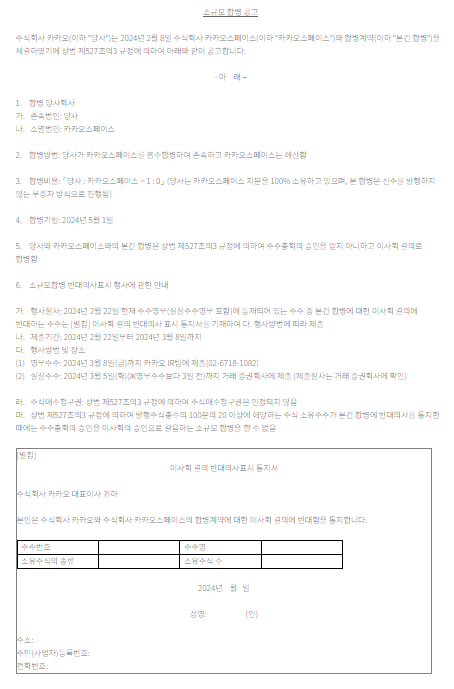 ✅ 카카오 소규모합병에 반대하는 주주가 반대의사를 표시하기 위해서는 반대의사 표시 통지서를 작성하여 제출해야 합니다.