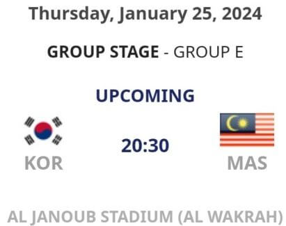 3) 2024 1월 25일 목요일 22:30 한국 vs 말레이시아 (알자누브 경기장)