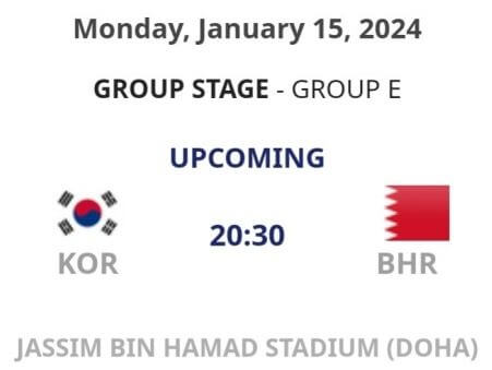 1) 2024 1월 15일 목요일 22:30 한국 vs 바레인 (자심빈 하마드 경기장)